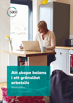 Många akademiker har stora möjligheter att själva bestämma när och var arbetet ska ske. Denna frihet upplevs ofta som någonting positivt. Men det innebär också utmaningar och risker ur ett arbetsmiljöperspektiv. Saco har tagit fram en policy för hur man kan skapa balans i det gränslösa arbetslivet.