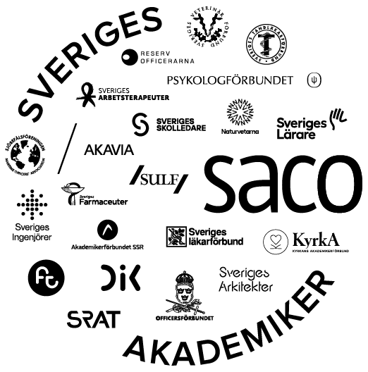 Sacos samverkanslogotyp består av våra 21 förbunds logotyper samlade i en cirkel tillsammans med texten Sveriges akademiker. Den ska inte ses som en logotyp för en organisation, det innebär att den inte ska användas som avsändare för ett budskap.