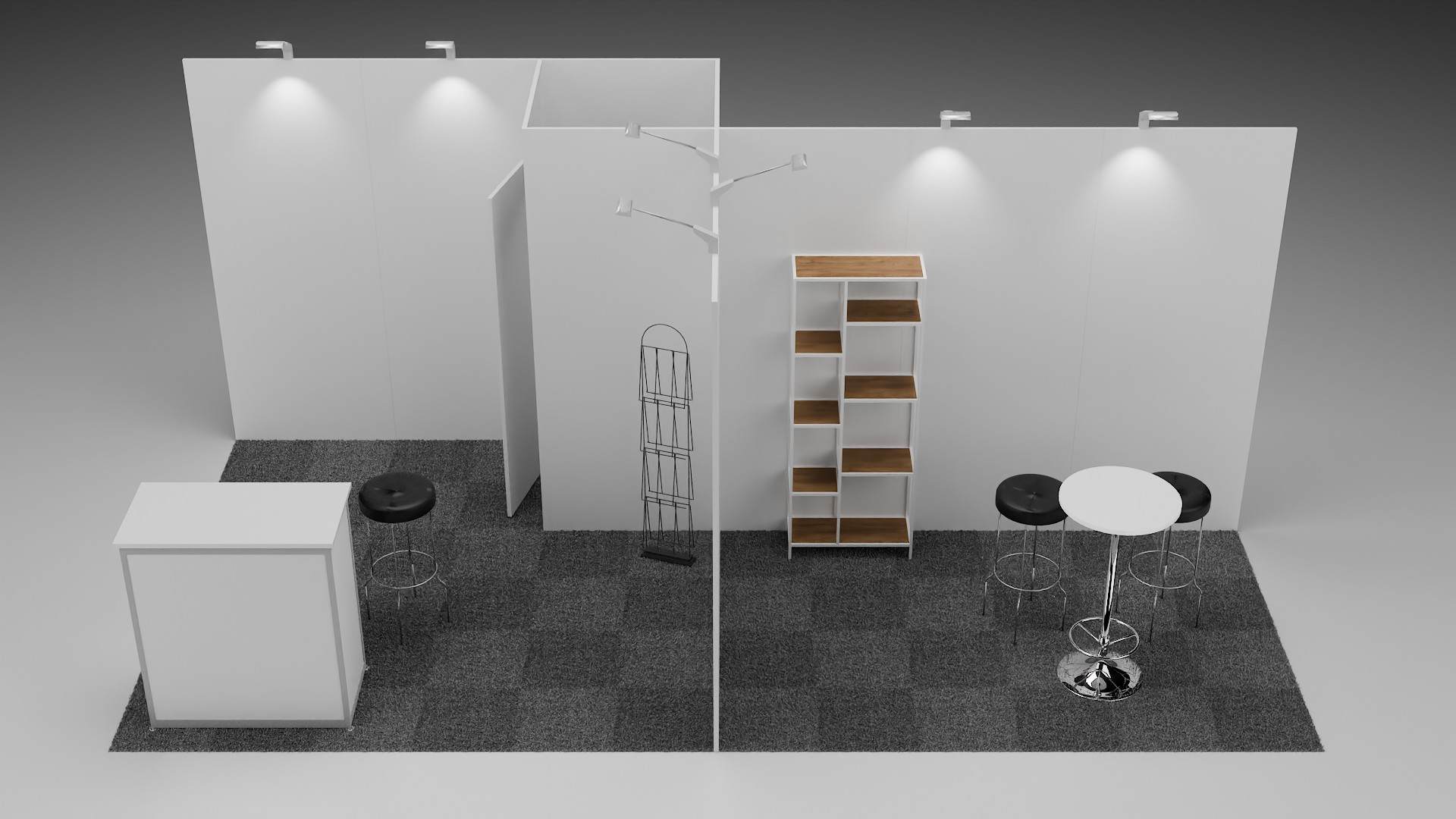 Väggar, hyrmatta i valfri färg, 1 spotlight per löpmeter vägg, elanslutning, städning samt fritt val av möbler i rimlig mängd från från angivet urval på Nordic Expo Services webbshop för Saco Studentmässa.